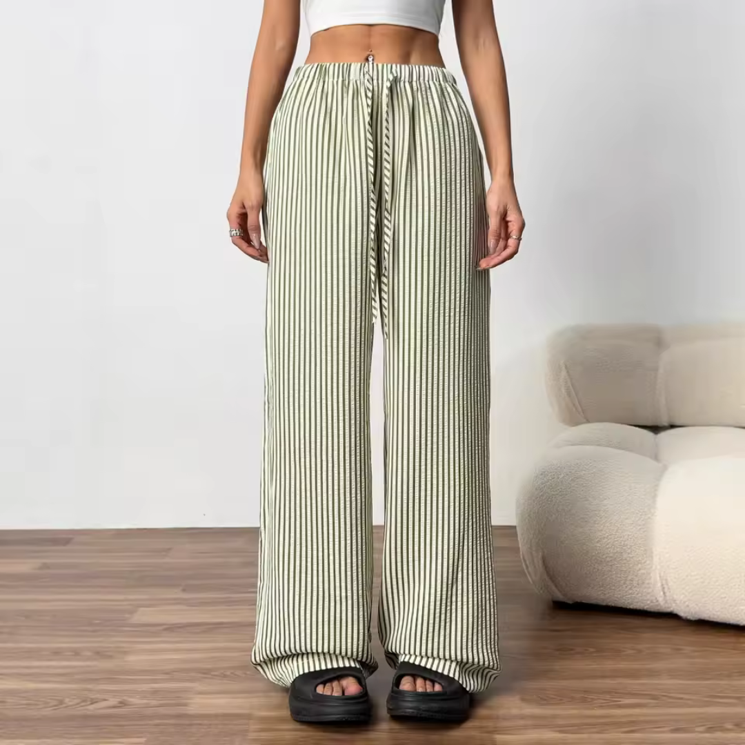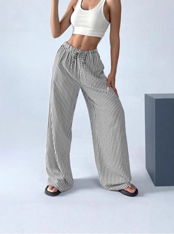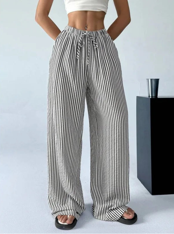 Sofie | Komfortlinnebyxa är en lätt och elegant byxa med en avslappnad silhuett som ger ett stilrent och modernt uttryck. Den luftiga passformen och det tidlösa randmönstret skapar en sofistikerad och avslappnad stil som passar perfekt både till vardags och under lugna sommardagar.