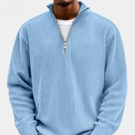 Axel | Ribbstickad Tröja är en stilren och modern tröja som kombinerar komfort med ett sofistikerat uttryck. Den ribbstickade strukturen och den eleganta halva dragkedjan ger ett självsäkert och välklätt intryck som passar perfekt både till avslappnade vardagsoutfits och mer genomtänkta stilar. Den mjuka ljusblå färgen ger ett fräscht och modernt uttryck som lyfter din outfit på ett naturligt sätt.
